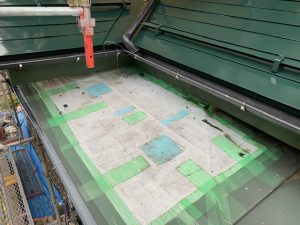 屋根の勾配が低いために雨水がうまく排水されず、腐食箇所からの雨漏れです。