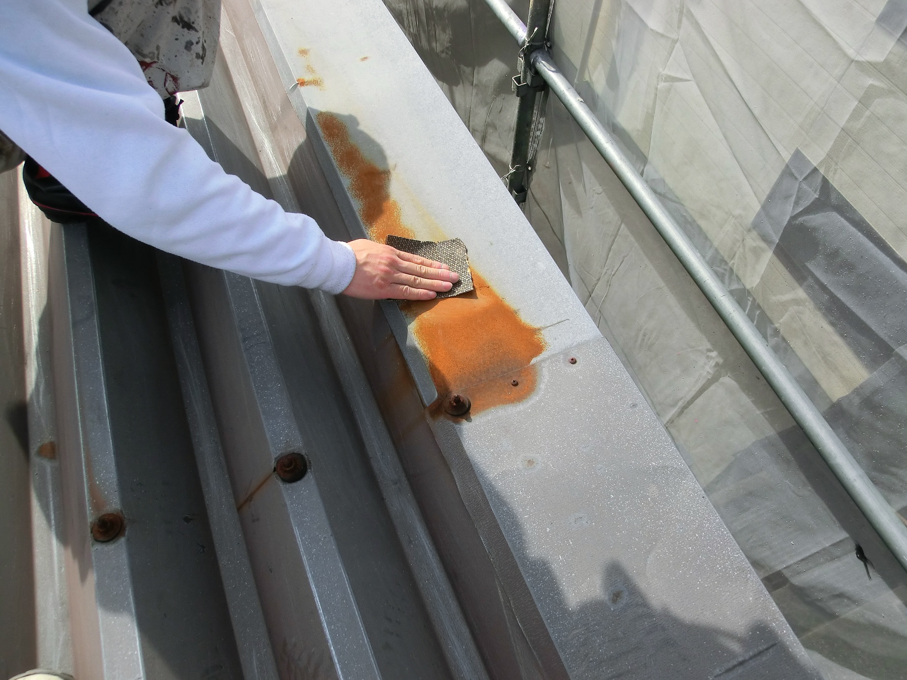 今日の作業は破風板の下塗りと鉄部の錆止めです。