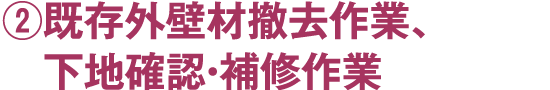 事前に取り外す必要のある竪樋や外部住設機器等を取り外した後、既存の外壁材を撤去していきます。外壁材を撤去した後、下地の傷みを確認し、補修の必要がある場合は補修作業を行います。
