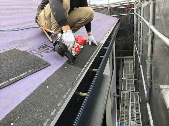 スターターという1枚目の屋根材を張るための下地を、専用の釘打ち機を使い取り付けていきます。