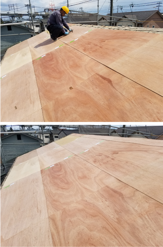 既存の野地板の上から補強、穴の空いていた箇所の修繕も兼ねてベニヤ板を隙間なく張り合わせていきます。