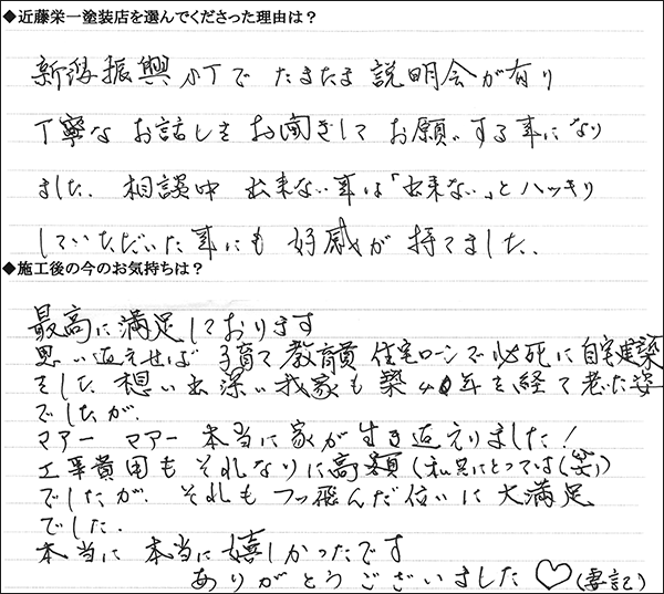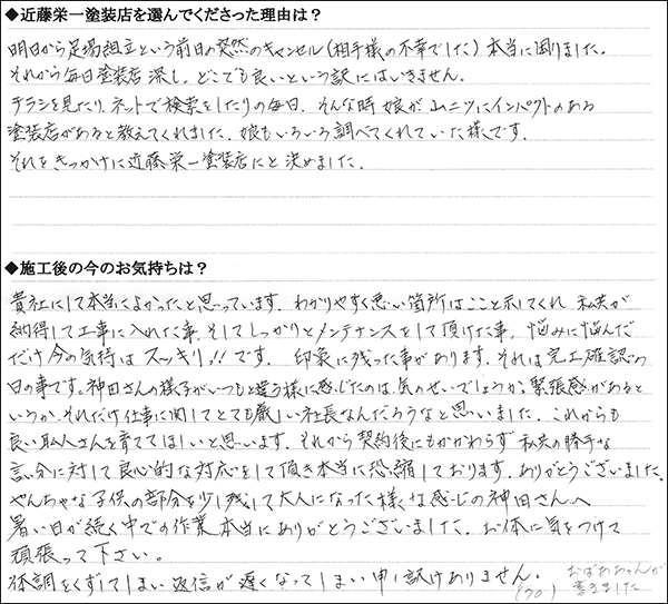 貴社にして本当によかったと思っています。わかりやすく悪い箇所はここと示してくれ私共が納得して工事に入れた事、そしてしっかりとメンテナンスをして頂けた事、悩みに悩んだだけ今の気持ちはスッキリ!!です。印象に残った事があります。それは完工確認の日の事です。神田さんの様子がいつもと違う様に感じたのは気のせいでしょうか。緊張感があるというか、それだけ仕事に関して厳しい社長なんだろうと思いました。これからも良い職人さんを育ててほしいと思います。それから契約後にもかかわらず、私共の勝手な言い分に対して良心的な対応をして頂き、本当に恐縮しております。ありがとうございました。