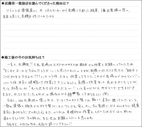 前回、前々回も施工して頂き、仕上げの綺麗さ等、大変満足しています。