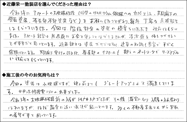 令和3年にアパートの大規模修繕(外壁のガルバリウム鋼板へのカバー工法、共同廊下の壁面塗装、専有部木部塗装など)をお願いしたことがあり、毎年丁寧な点検報告してもらっていました。今回は、階段部分の塗装の提案をいただき対応してもらいました。アパート経営は無尽蔵にお金を使うことはできませんが、清潔感を保ちつづけることが重要だと思っています。近藤親方は塗装だけではなく、建築の知識も豊富で、すごく信頼しています。共同廊下電灯のLED化、専有部のリフォームも親方のネットワークでリーズナブルに対応してもらっています。