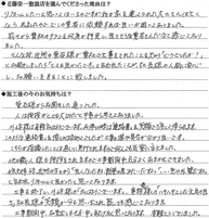 このような「連絡書」を頂くのは初めてでしたが、工事の進み具合が分かり良いです。こちらが指摘したことは直ぐに実行されますので何でも気楽に言えました。他の職人様も挨拶をされますので工事期間中、気分よくおまかせできました。娘夫婦、孫、近所の方々から「良くなったね。新築の家みたいだね」「いい色の外壁だね」と言われ、リフォームして良かったと思っております。