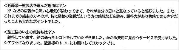 ネットで数ある塗装店のなかから、近藤さんの概念、施行主さんのコメント等共感がもてる場が多数あり、知り合いの塗装店や営業訪問で来られる方もいましたが、近藤さんの方が優ると思い決めました。