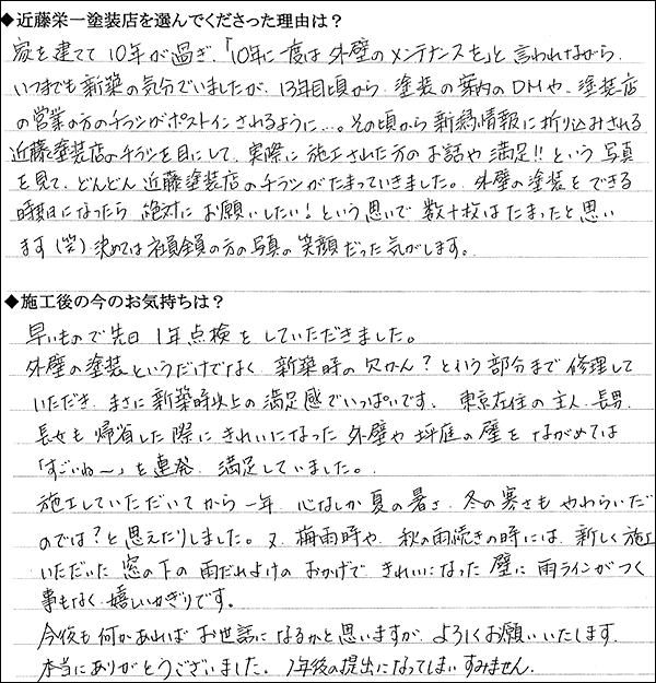 我が屋は、外壁張替工事をしてから、14年位経過していることから、そろっと外壁を何とかしなくては、考えていた所、近藤栄一塗装店さんの新聞折込チラシを拝見して、とりあえず、御見積だけでもとお願いしました。ところが、数日経って、御見積資料を拝見させて頂いたら、素人にも極めて判りやすい、塗装ケ所の診断結果が、写真と説明付で提案されていて、判りやすく大変感心し、この会社なら絶対大丈夫と考え、即、塗装をお願いする決断をしました。