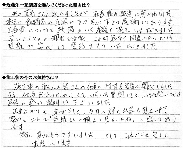 今回で4回目の依頼となりました。どんな事を相談しても、心良く、丁寧に説明して下さり、最後までお客の満足度を心がけている社長の姿勢に、信頼できる会社だと思いまして、この度もやはり、近藤栄一塗装店にお願いしようと思いました。
